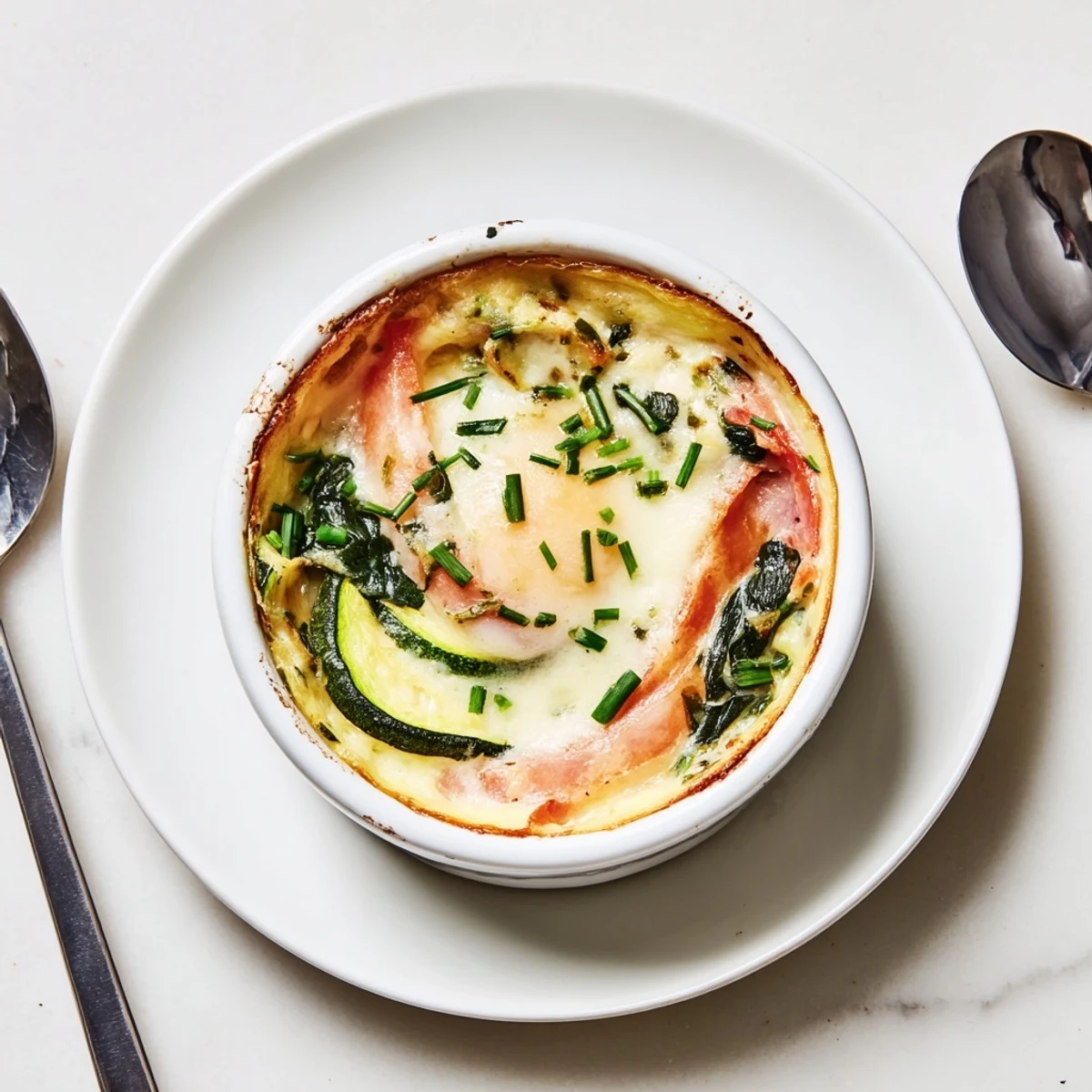 - Place pastry or bread in each ramekin, then layer with spinach, zucchini, tomato, and ham or mushrooms