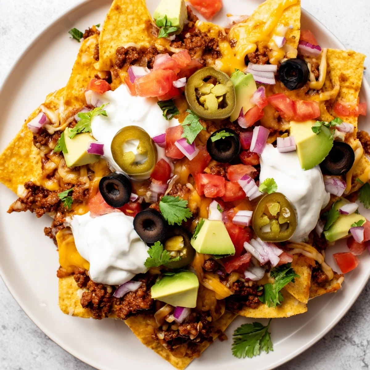 This dish features crispy tortilla chips layered with seasoned ground beef infused with cumin, chili, and paprika. Melted cheddar and Monterey Jack cheeses add rich flavor, while fresh tomato, red onion, jalapeño, olives, cilantro, and diced avocado provide vibrant color and texture. Finished with cool sour cream, it offers a harmonious blend of spicy, creamy, and fresh notes. Ready in 30 minutes, it's an easy and satisfying dish for sharing.